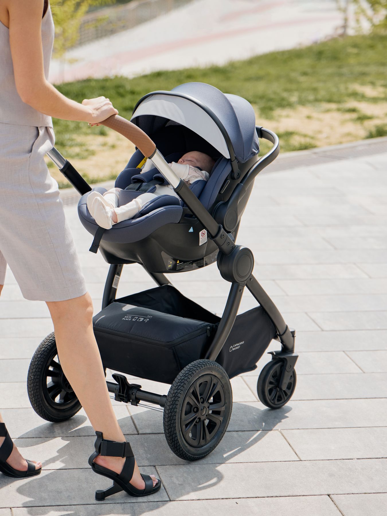 The exquisite SKYLER PRO car seat is an indispensable assistant for a mother in the first year of a child’s life. Thanks to the possibility of attaching a car seat to the chassis of the MOMMER PRO, MOMMER and LINDA strollers, mothers can maintain an active lifestyle and travel with their baby more often. The elegant lines continue with the soft, anatomical liner design that provides extra comfort during your ride. The folding hood will protect the baby from the sun, and the comfortable handle allows you to carry it without any extra effort, just like in a regular cradle. When creating SKYLER PRO, we paid increased attention to safety, so the infant carrier has reliable side protection and three-point belts with soft pads for greater child comfort. Thanks to the semicircular base, it is convenient to rock the baby; you can use the carrying handle as a rocking limiter, lowering it all the way down. The car seat is secured in the car using standard seat belts and installed against the direction of travel of the car.