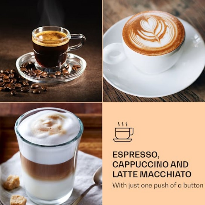 For passionate coffee lovers: the Klarstein Arabica Comfort espresso machine can prepare delicious espresso, cappuccino and latte macchiato at the touch of a button. Thanks to the 90° stainless steel frothing nozzle and the removable milk tank, you can individually control the milk foam production. In addition, you can brew ground coffee or use a practical coffee capsule. Thanks to the removable water tank and shooting filters, cleaning the device is simplified.