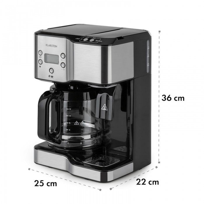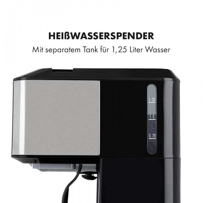 The Klarstein Caldetto coffee machine with a power of 1900 W passes hot water through the ground coffee beans and thus releases their full aroma. With a practical hot water dispenser, tea and soup lovers will also appreciate the device. Hot water can be obtained by simply pressing the lever. Coffee and tea lovers do not interfere with each other, since the coffee machine has two separate water tanks. The water tank holds 1.8 liters of water, allowing you to brew up to 12 cups of coffee. The hot water dispenser has a 1.25 liter tank. Here the water remains hot for up to 2 hours. Caldetto has a timer function.  It is controlled using a convenient control panel. Cleaning the Caldetto is also easy, as the grill and drip tray are easily removable.