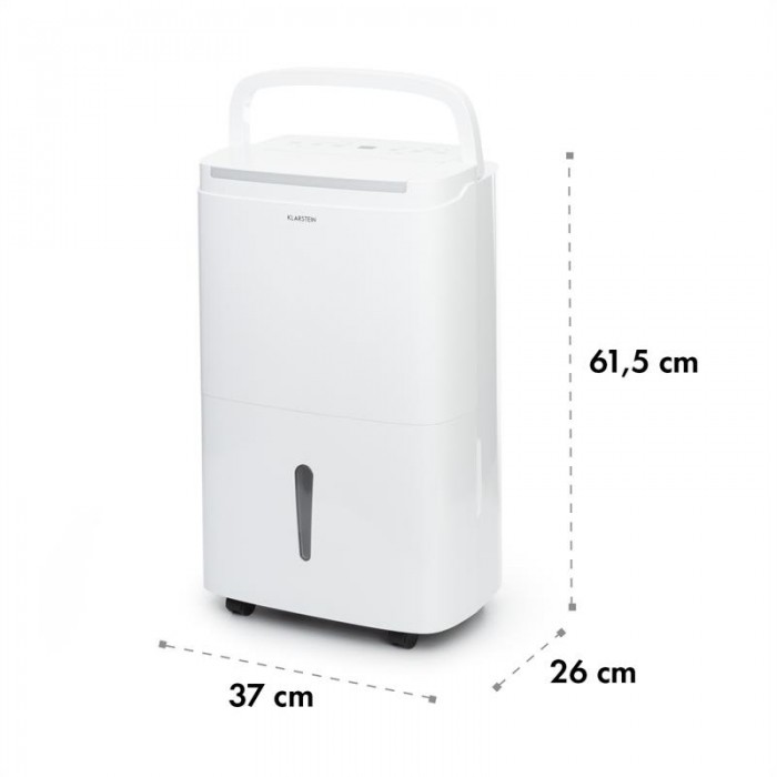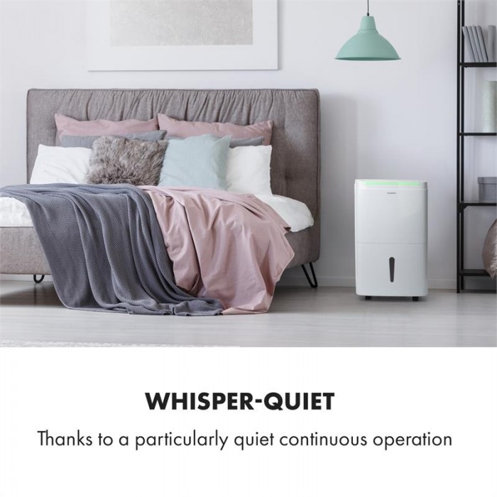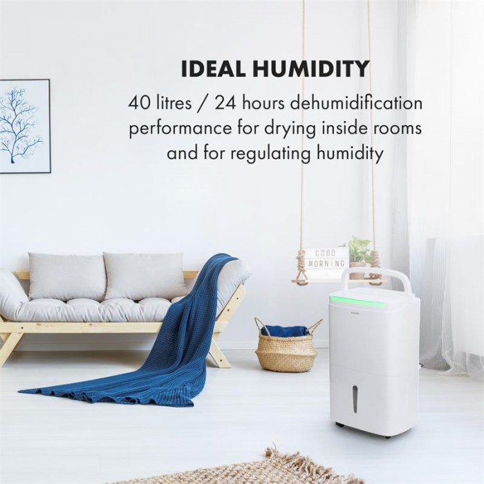 The Klarstein DryFy Connect 40 dehumidifier with WiFi interface dehumidifies damp areas after construction or renovation work and easily regulates the air humidity in kitchens, bathrooms or bedrooms. Klarstein DryFy 40 instantly removes moisture from the air and allows you to breathe freely. Thanks to an air circulation of 360 m³ per hour, it can remove up to 40 liters of water per day from the air. The Klarstein DryFy Connect 40 dehumidifier is therefore ideal for rooms between 35 and 45 m². The large 7-liter tank collects water and can be easily emptied when needed thanks to an audible alarm and an automatic shut-off that activates when full. Thanks to the Wi-Fi interface, it can be easily connected to your home network and controlled. The Klarstein DryFy Connect 40 can also purify the air thanks to its built-in activated carbon filter, which removes dust and odors, as well as small particles and germs from the air. Thus, one device improves the indoor microclimate. The device is also practical due to its ease of use: the screen located at the top allows it to be programmed using a few keys. This way, you can not only set a target humidity, but also program a timer in hourly increments.