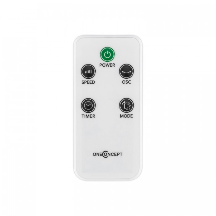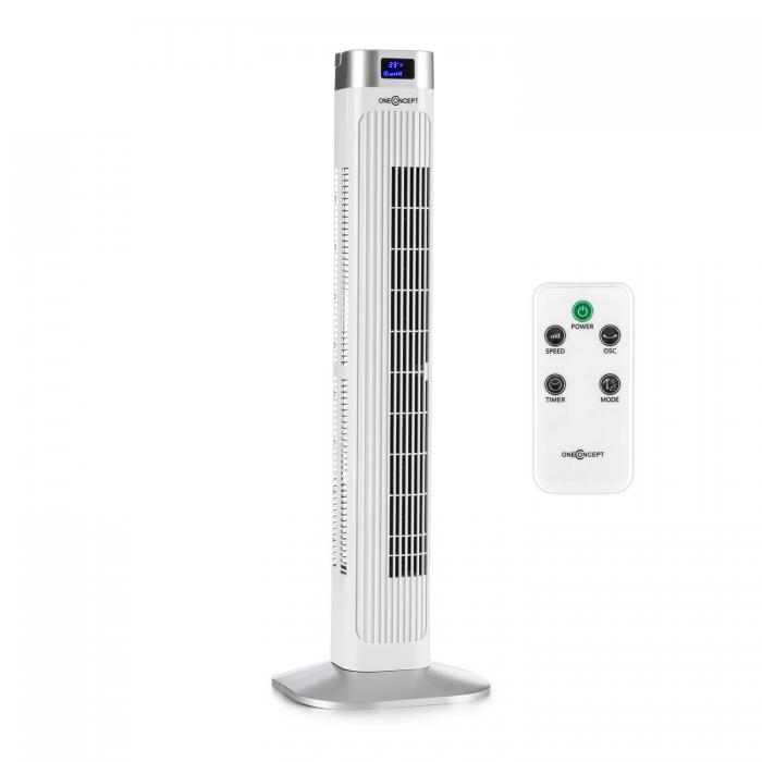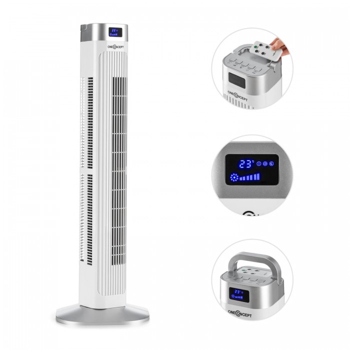 The OneConcept Hightower 2G fan is used to freshen the air in a room; it has three speeds: from gentle to strong flow of fresh air. With the press of a button, the tower can rotate 45°, increasing air circulation in the room. An adjustable timer can be used to automatically turn off the fan after a set time from 1 to 12 hours. The OneConcept Hightower can be operated either using buttons on the top of the device or using a remote control. Its large blue backlit LCD display shows the set parameters and modes, as well as the current room temperature. The fan’s elegant appearance makes it ideal for offices and living rooms, but is neutral enough to fit well even into more classic interiors. Using only 50W of power consumption, it is also energy efficient.