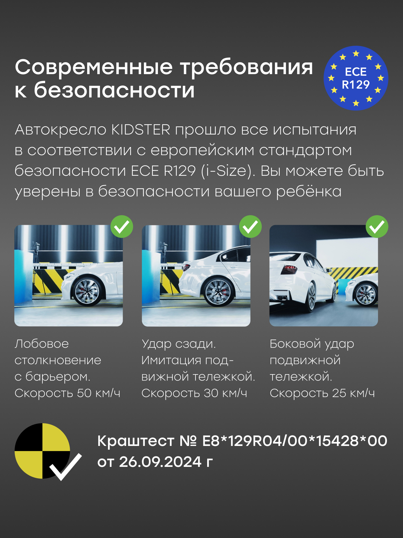 The KIDSTER child car seat is the ideal choice for parents who value safety, convenience and durability. Compliance with the European standard ECE R129/04 guarantees reliable protection thanks to the side shock absorption system and five-point belts with soft pads. The car seat is suitable for children from 0 years old, providing comfort from the first months of life until they reach a height of 150 cm. The key feature is the 360° swivel base, which makes it easier to get the baby in and out. The chair can be installed facing or backwards, adapting to the age stages of development. The anatomical memory foam pillow supports the correct shape of a newborn’s head, and the adjustable backrest and headrest allow you to customize the position to suit your child’s needs. The model is equipped with an ISOFIX system for quick and reliable fixation in the car. A durable frame and wear-resistant materials make the car seat for a newborn a universal solution for several years. The car seat undergoes mandatory crash tests (crash test number: E8*129R04/00*15428*00 dated September 26, 2024) during certification (child seat safety certificate ECE R129/04)