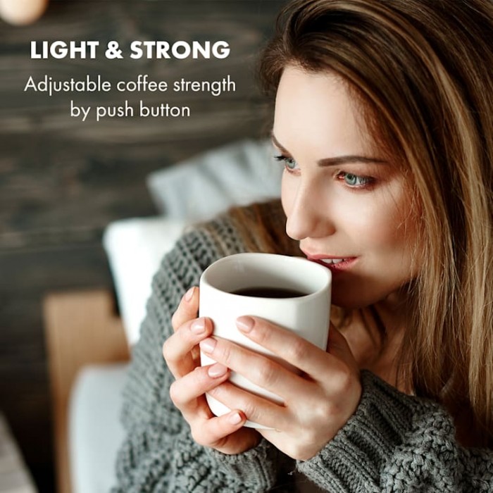 The Klarstein Grind & Brew coffee maker is convenient and easy to use thanks to the intuitive control panel. The start and end times of brewing are easily adjusted with the start/stop button, and the choice of 2-4-6-8 or 10 cups is suitable for all fans of the automatic process. The strength of the coffee can be adjusted using the buttons. The coffee pot capacity of up to 1250 ml allows you to brew up to 10 cups, making it ideal for large groups. You have two operating modes available: pour ground coffee into the filter yourself or use the built-in coffee grinder, which grinds beans with a fresh aroma. The degree of grinding from coarse to fine is adjusted by a rotary mechanism on the top of the device. The efficient design forces the powder into the center of the filter for even brewing. The removable 1 liter water tank is easy to fill and clean. The stylish design makes the Klarstein Grind & Brew the perfect addition to any modern kitchen.