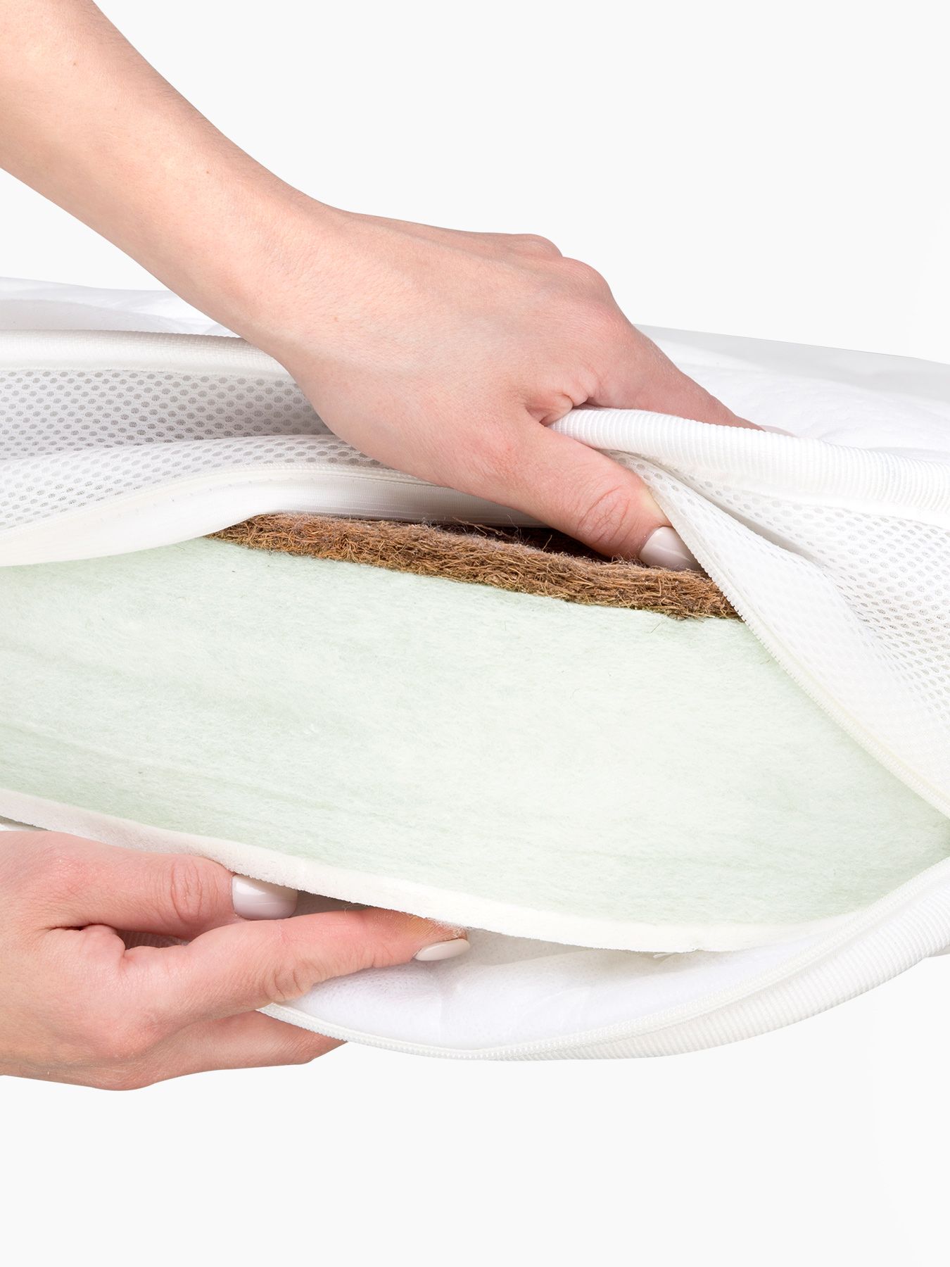 The Happy Baby mattress is ideal for babies from birth and meets all the requirements for a child’s healthy sleep: it is hard, without springs, made of high-quality materials and has an optimal thickness of 110 mm. The model is designed for sleeping at different ages. On one side there is a 10mm layer of natural latex coconut coir, which provides the maximum orthopedic effect necessary for a newborn (hardness 5 out of 5). On the other hand, there is latex, a natural elastic material that will give the child special comfort due to the point distribution of the load. We recommend that children after one year sleep on this side (layer 10 mm, hardness 4 out of 5). The mattress is based on the latest development of Hollcon Eucalypt, which combines the advantages of natural and innovative materials. The filler has antibacterial properties, perfectly restores its shape, and is odorless. The quilted double-layer mattress cover is removable, easy to machine wash and dries quickly.