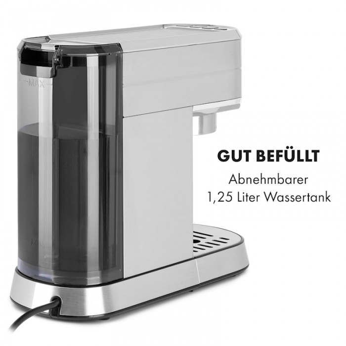 Thanks to a pump pressure of 20 bar, the Klarstein espresso machine forces water through the coffee to produce a very strong and rich aroma. Whether single or double espresso: you can choose, the device has a capacity of 2 cups and the water tank holds 1.25 liters. Thanks to a sophisticated rapid heating system with a thermoblock, the water heats up quickly and the espresso is prepared within a few minutes. Treat yourself to the best coffee drinks with the elegant Klarstein Futura espresso machine at home. Experience first-class pleasure, maximum comfort and an elegant, compact design.