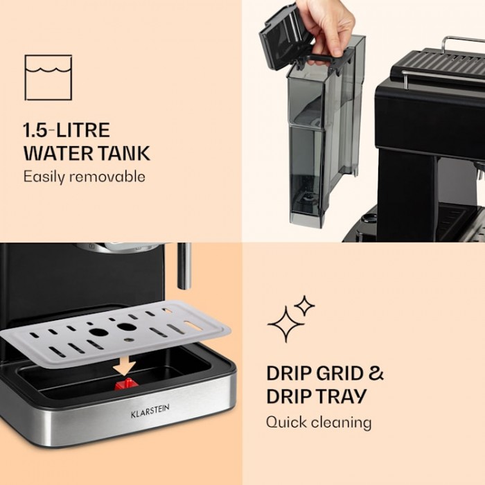 The Gusto Classico espresso machine from Klarstein not only captivates your palate with powerful, aromatic, freshly brewed coffee – the spectacle is also a real feast for the eyes. Feel the seductive aroma as the 20 bar espresso machine releases the full aroma of the coffee with its quirky retro design and 20 bar pressure. The espresso machine is suitable for both ground coffee and coffee capsules.