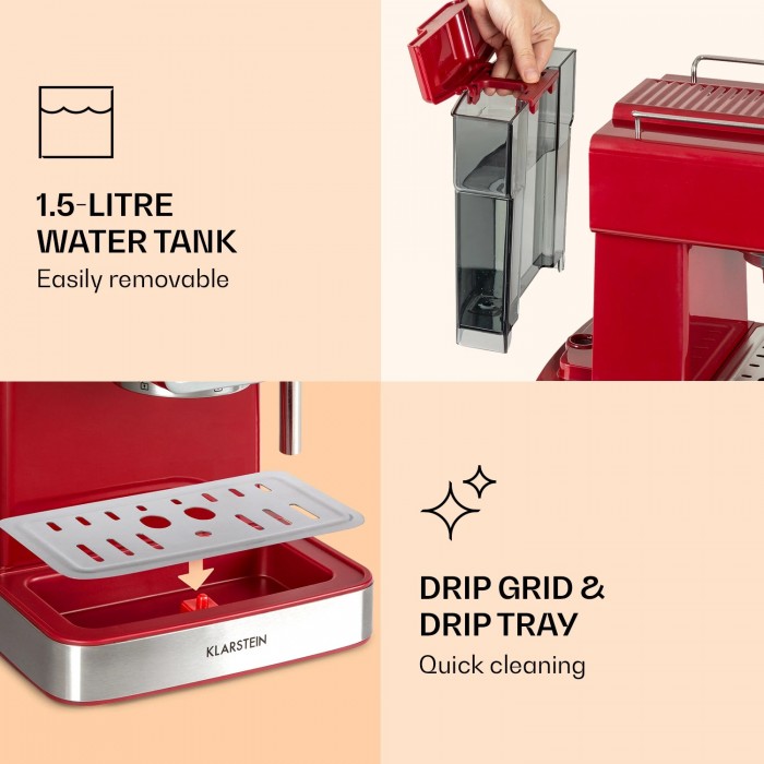 The Gusto Classico espresso machine from Klarstein not only captivates your palate with powerful, aromatic, freshly brewed coffee – the spectacle is also a real feast for the eyes. Feel the seductive aroma as the 20 bar espresso machine releases the full aroma of the coffee with its quirky retro design and 20 bar pressure. The espresso machine is suitable for both ground coffee and coffee capsules.