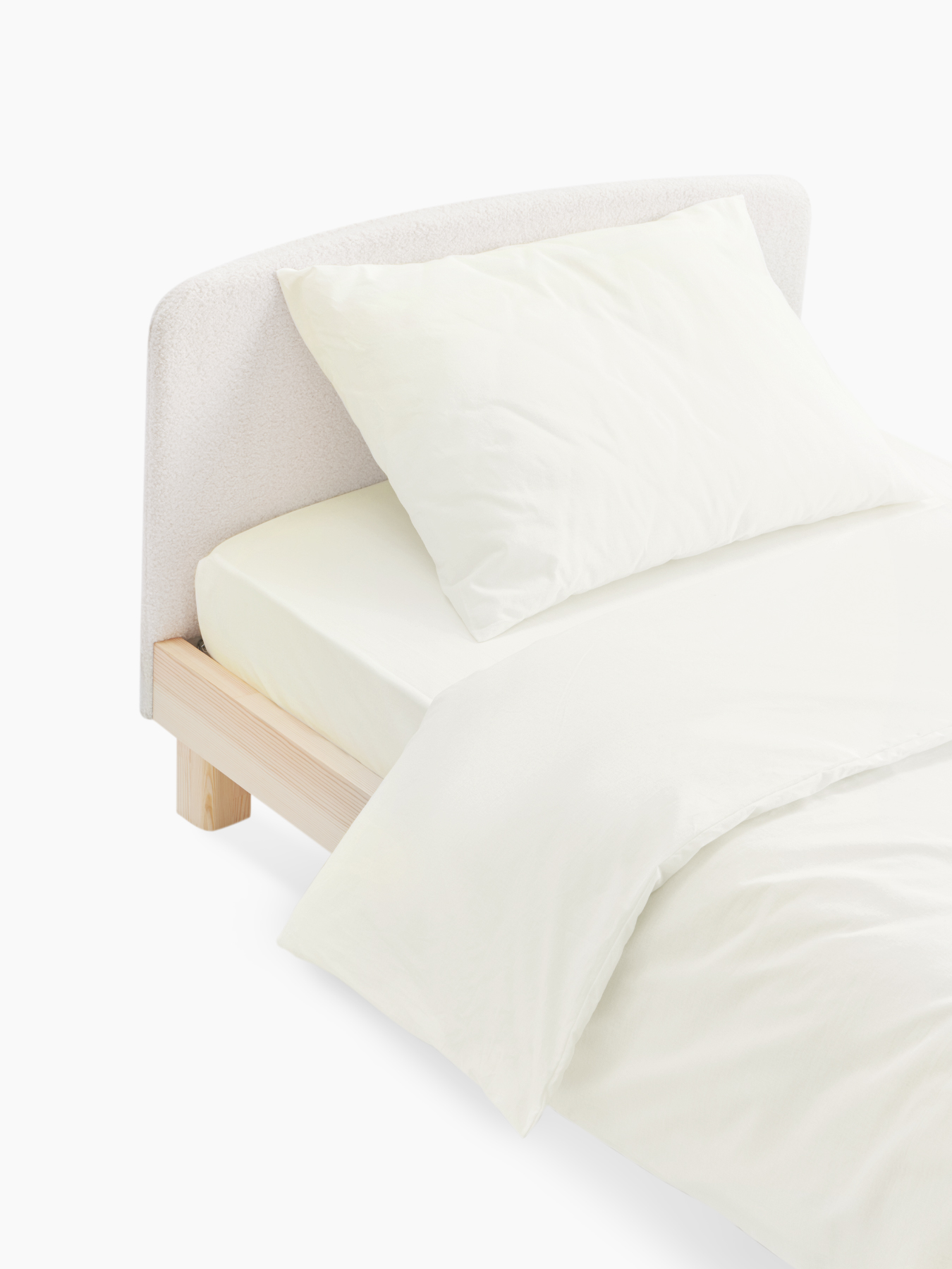 The set of 3 items includes: • Children’s bed SOMNA • Mattress for bed SOMNA 180x90cm • Bed linen set for 1.5 bedrooms (duvet cover, pillowcase, fitted sheet) Children’s bed SOMNA Article: 95045 Quantity in set: 1 Color: milky Composition: natural wood, MDF, polyester The SOMNA children’s bed is a stylish and functional solution for ensuring comfortable sleep. Made from high quality materials, this bed combines durability, naturalness and aesthetics. The solid pine frame provides a durable structure and natural appeal. The uncoated frame emphasizes the natural texture and color of the wood, which adds a cozy feel to the interior. The laminated birch base ensures proper weight distribution and support for your mattress, promoting healthy sleep and rest. The MDF headboard ensures strength and durability. The bouclé polyester cover gives the bed a cozy and tactile appearance. Mattress for bed SOMNA 180x90cm Article: 95043 Quantity in set: 1 Color: white Composition: filler – highly elastic foam (90 mm), polyurethane foam with “shape memory” Visco Memory Foam (20 mm); cover – removable quilted knitted cover “Honeycombs” (100% polyester) This is an ideal solution for maintaining comfortable and healthy sleep for your child during his childhood, from kindergarten to school age. This mattress provides reliable support and provides optimal conditions for quality rest. The mattress filling consists of highly elastic foam and polyurethane memory foam. This combination provides the optimal thickness of the mattress, while each layer supports the natural contours of the child’s body, creating a cozy and comfortable sleeping environment. The main properties of the mattress include thermoregulation, moisture management and antistatic properties. In addition, the mattress is easy to clean due to its removable zippered cover. Designed specifically for the Somma crib, the size of 180 x 90 cm makes it the perfect match for this model. With two firmness levels (3 and 4 out of 5), you can choose the optimal firmness level based on your child’s preferences. 1.5-bed bedding set (duvet cover, pillowcase, fitted sheet) Article number: 87559 Quantity in set: 1 Color: milky Composition: 100% cotton Refresh the atmosphere of the children’s room with our 1.5-bed bed linen set for the crib. Consisting of three soft pieces made from 100% soft-touch cotton – a duvet cover (210×145), pillowcase (50×70) and a sheet (180×90 cm) – this set is designed to ensure comfort while you sleep. The elegant design with subtle hues and sophisticated details will add style to your child’s room, showcasing your attention to detail. Give your little one a gentle night’s sleep in tangible comfort and impeccable style – our set radiates warmth and joy in every moment of relaxation.